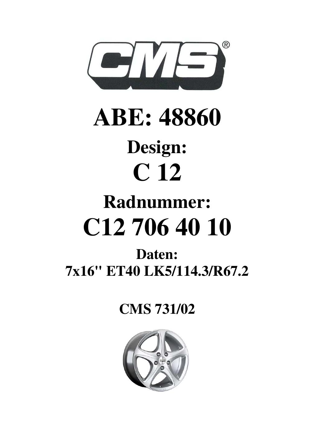 Dieses Gutachten (ABE) bezieht sich auf die Alufelge CMS C12 in der Ausführung 7Jx16 ET 0, Mittenloch 0 mm (KBA 48860). Im PDF findest du typischerweise zulässige Reifengrößen, Auflagen/Anbauhinweise und – je nach Dokument – Hinweise zur Eintragung.