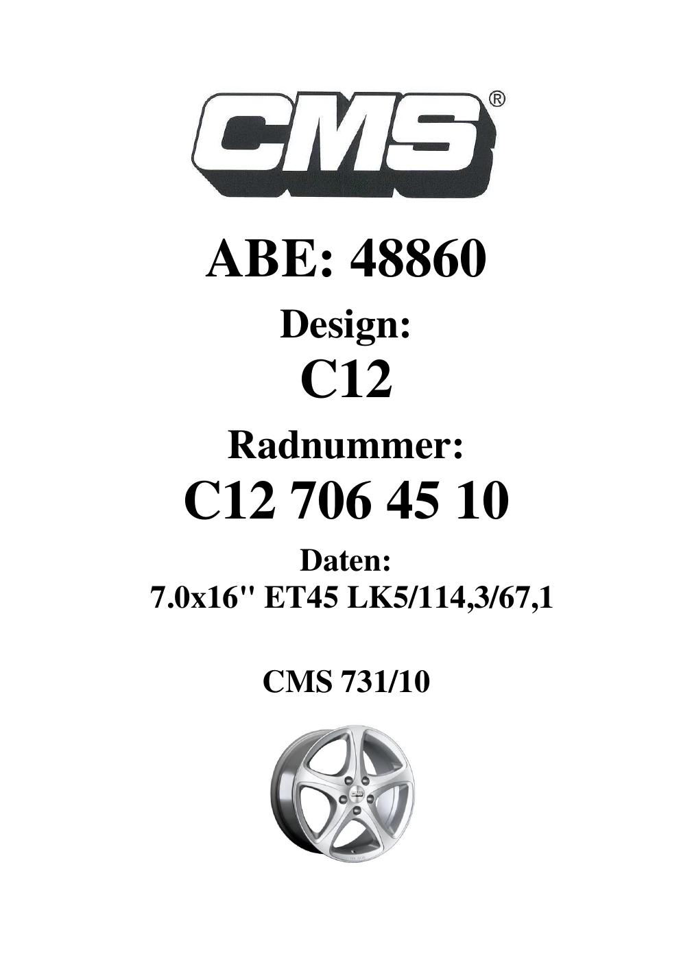 Dieses Gutachten (ABE) bezieht sich auf die Alufelge CMS C12 in der Ausführung 7Jx16 ET 0, Mittenloch 0 mm (KBA 48860). Im PDF findest du typischerweise zulässige Reifengrößen, Auflagen/Anbauhinweise und – je nach Dokument – Hinweise zur Eintragung.