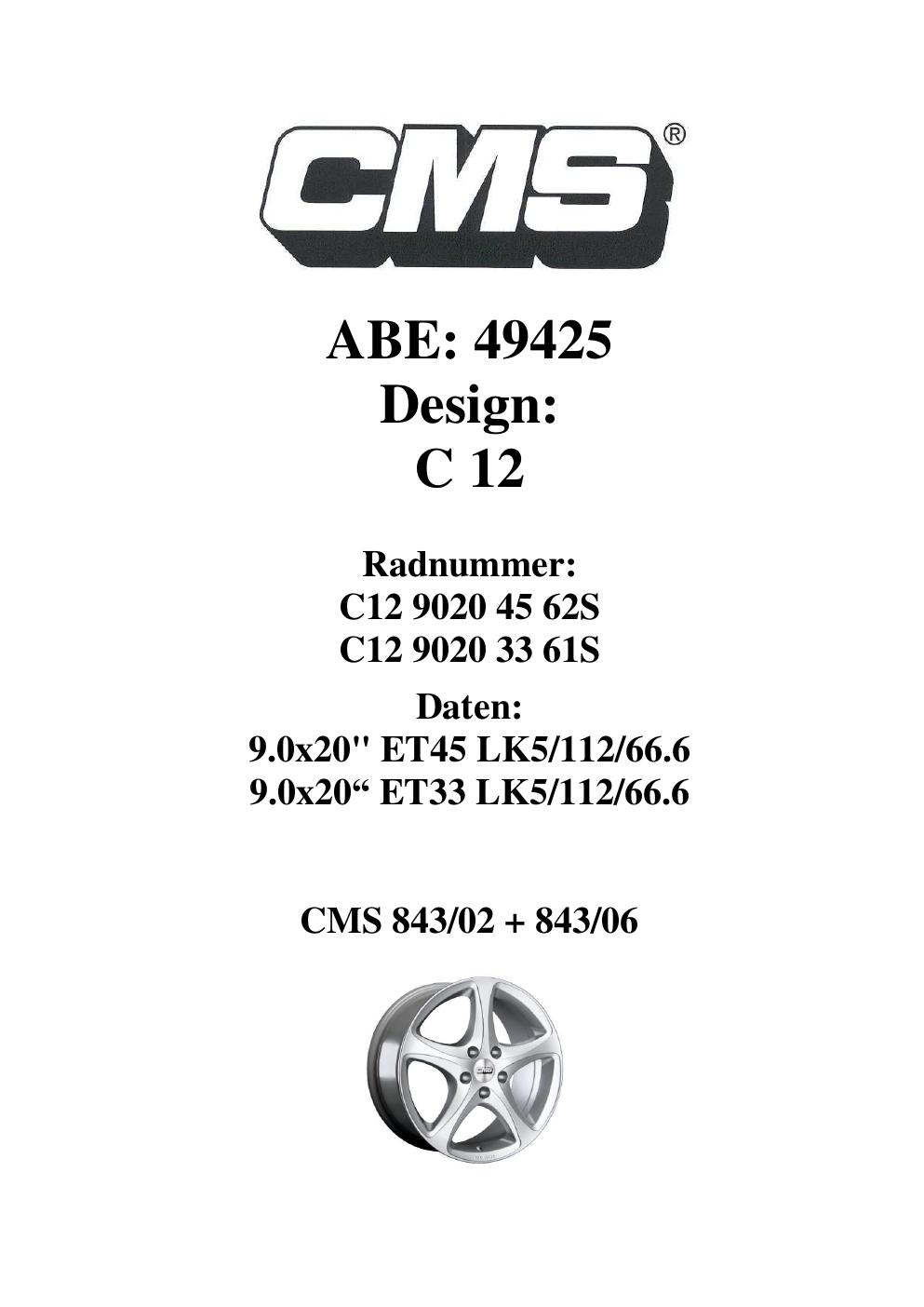 Felgengutachten / ABE für Alufelgen CMS C12 (9Jx2 ET 0, Mittenloch 0 mm) mit KBA 49425 (Zertifikatsnummer 49425). Hier kostenlos als PDF herunterladen. Der Download-Link ist 24 Stunden gültig und kann bis zu zwei Mal verwendet werden.