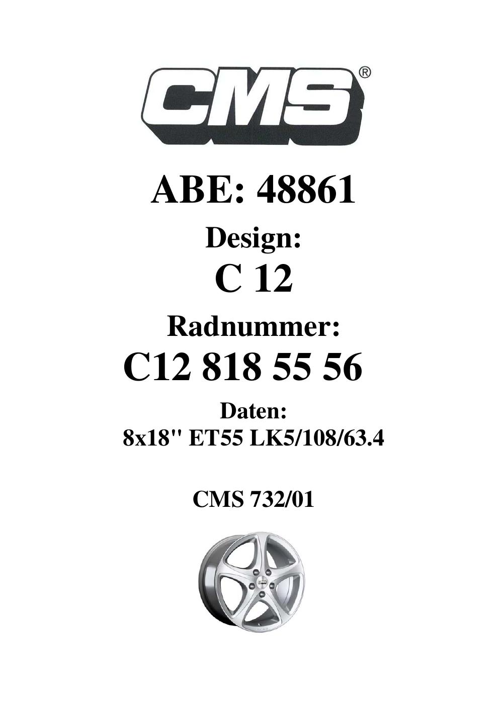 Dieses Gutachten (ABE) bezieht sich auf die Alufelge CMS C12 in der Ausführung 8Jx18 ET 0, Mittenloch 0 mm (KBA 48861). Im PDF findest du typischerweise zulässige Reifengrößen, Auflagen/Anbauhinweise und – je nach Dokument – Hinweise zur Eintragung.