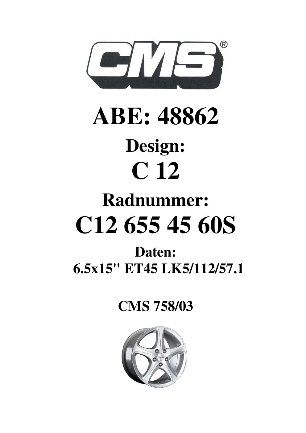 Dieses Gutachten (ABE) bezieht sich auf die Alufelge CMS C12 in der Ausführung 6.5Jx15 ET 0, Mittenloch 0 mm (KBA 48862). Im PDF findest du typischerweise zulässige Reifengrößen, Auflagen/Anbauhinweise und – je nach Dokument – Hinweise zur Eintragung.