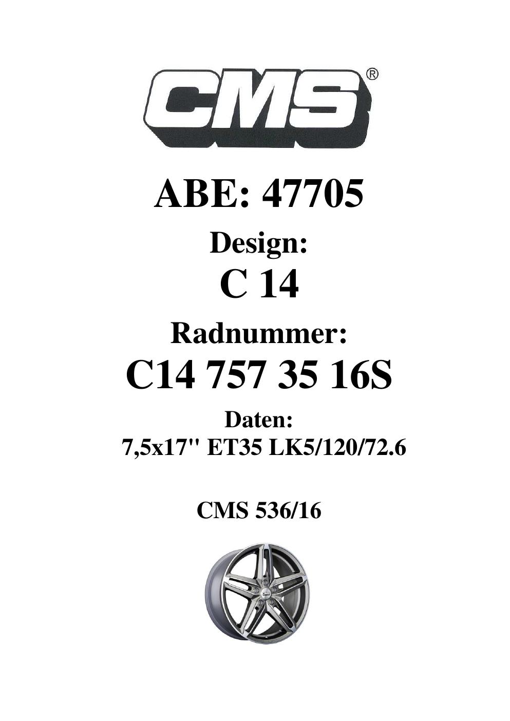 Dieses Gutachten (ABE) bezieht sich auf die Alufelge CMS C14 in der Ausführung 7.5Jx17 ET 0, Mittenloch 0 mm (KBA 47705). Im PDF findest du typischerweise zulässige Reifengrößen, Auflagen/Anbauhinweise und – je nach Dokument – Hinweise zur Eintragung.