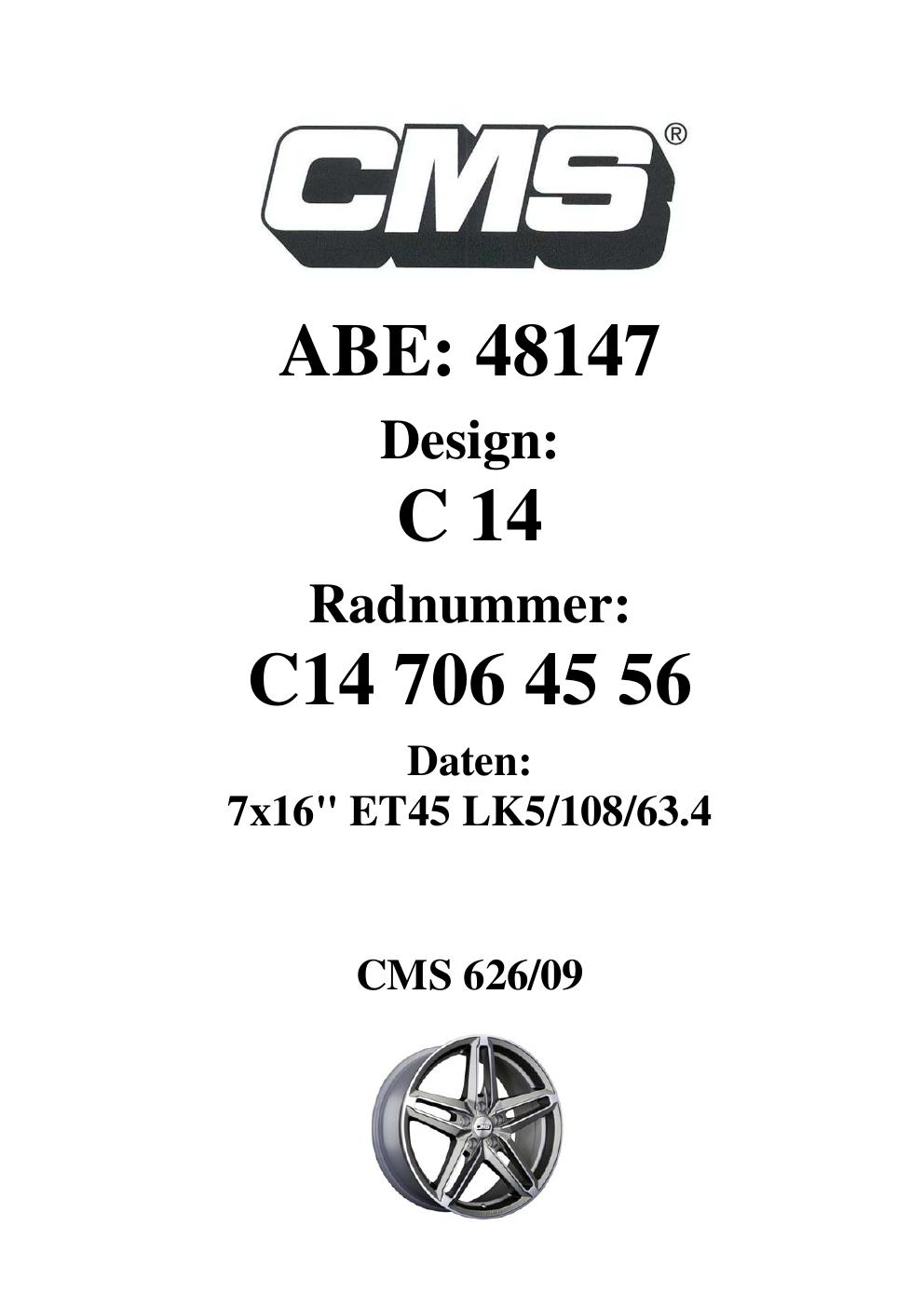 Dieses Gutachten (ABE) bezieht sich auf die Alufelge CMS C14 in der Ausführung 7Jx16 ET 0, Mittenloch 0 mm (KBA 48147). Im PDF findest du typischerweise zulässige Reifengrößen, Auflagen/Anbauhinweise und – je nach Dokument – Hinweise zur Eintragung.