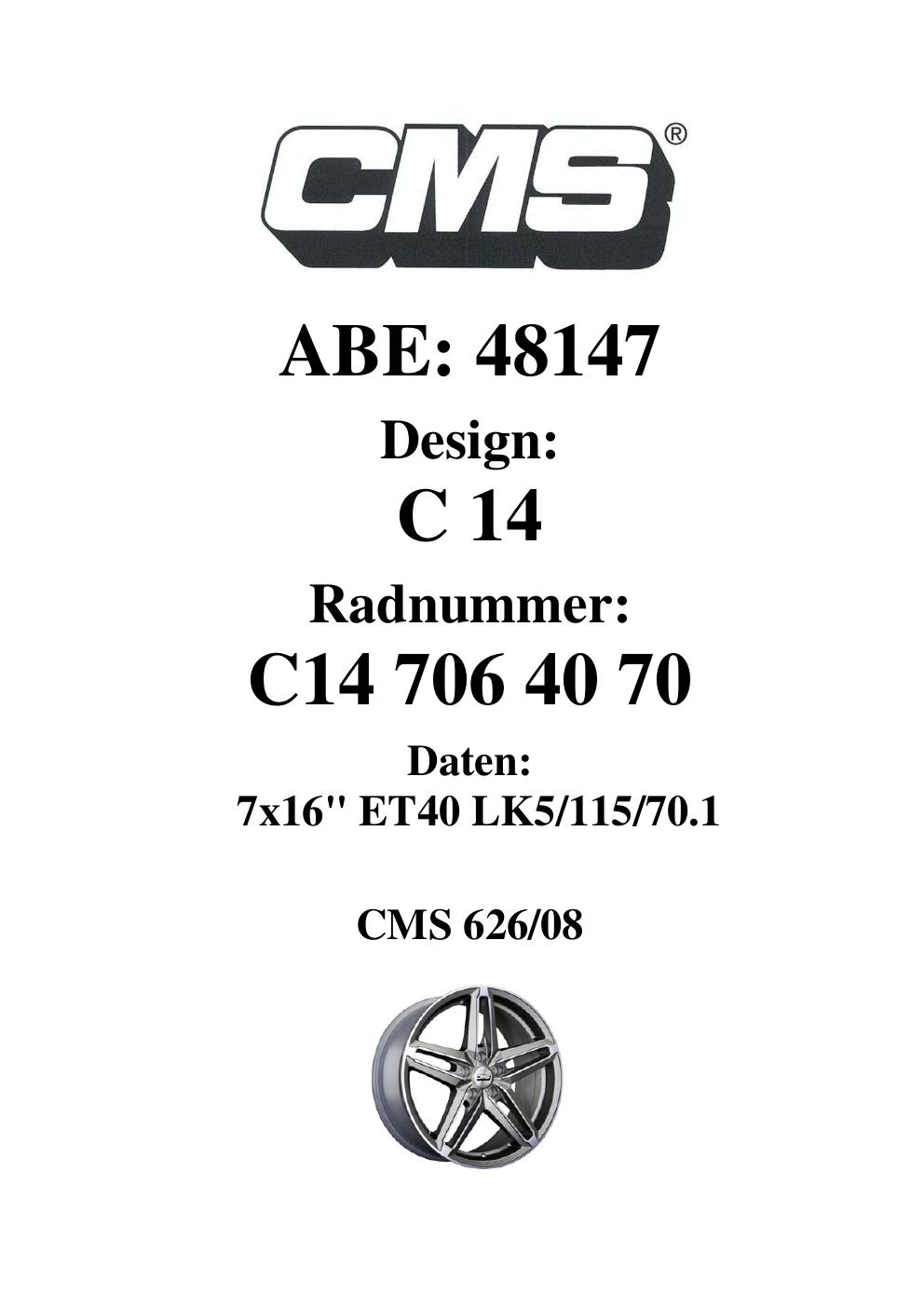 Dieses Gutachten (ABE) bezieht sich auf die Alufelge CMS C14 in der Ausführung 7Jx16 ET 0, Mittenloch 0 mm (KBA 48147). Im PDF findest du typischerweise zulässige Reifengrößen, Auflagen/Anbauhinweise und – je nach Dokument – Hinweise zur Eintragung.