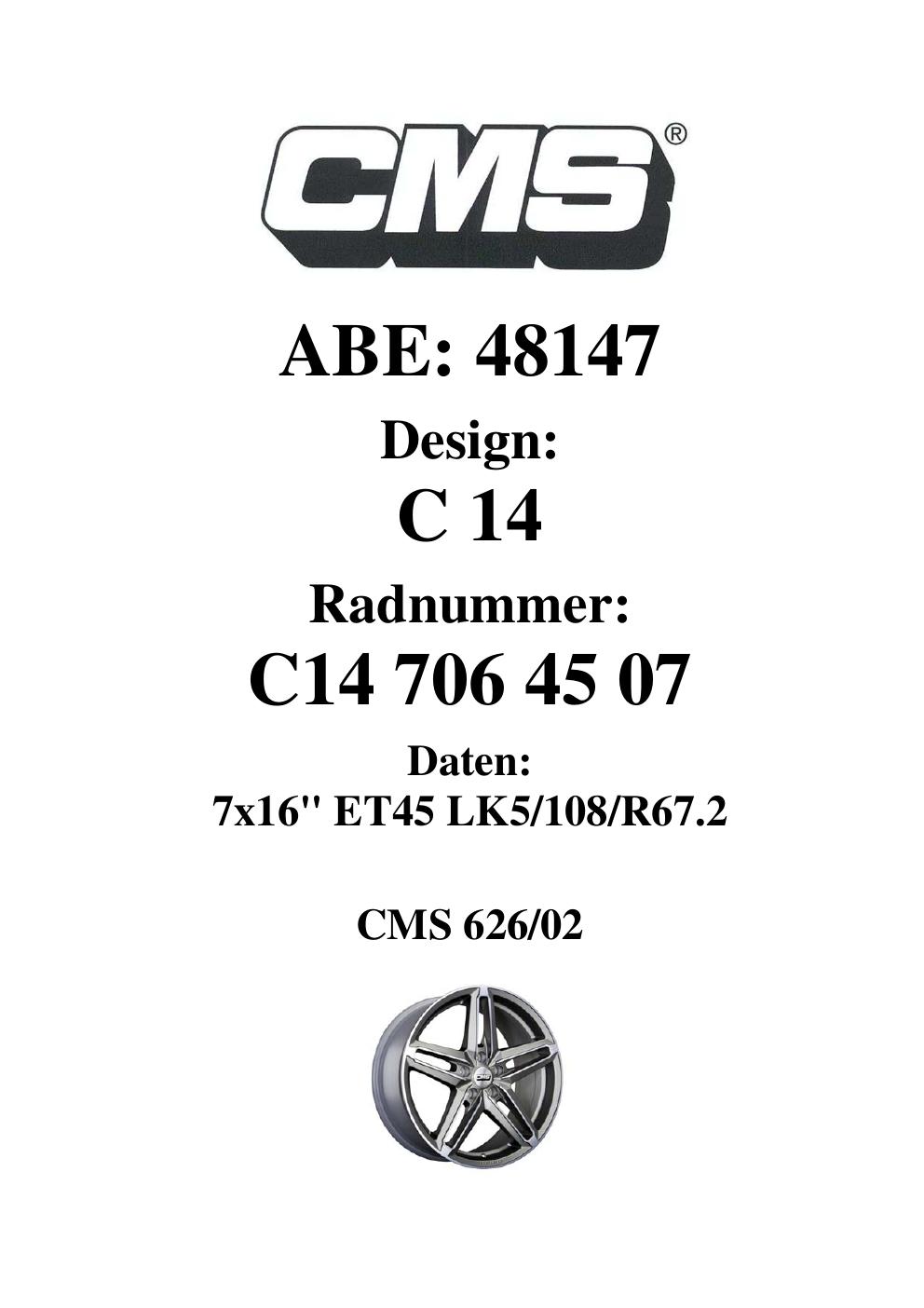 Dieses Gutachten (ABE) bezieht sich auf die Alufelge CMS C14 in der Ausführung 7Jx16 ET 0, Mittenloch 0 mm (KBA 48147). Im PDF findest du typischerweise zulässige Reifengrößen, Auflagen/Anbauhinweise und – je nach Dokument – Hinweise zur Eintragung.