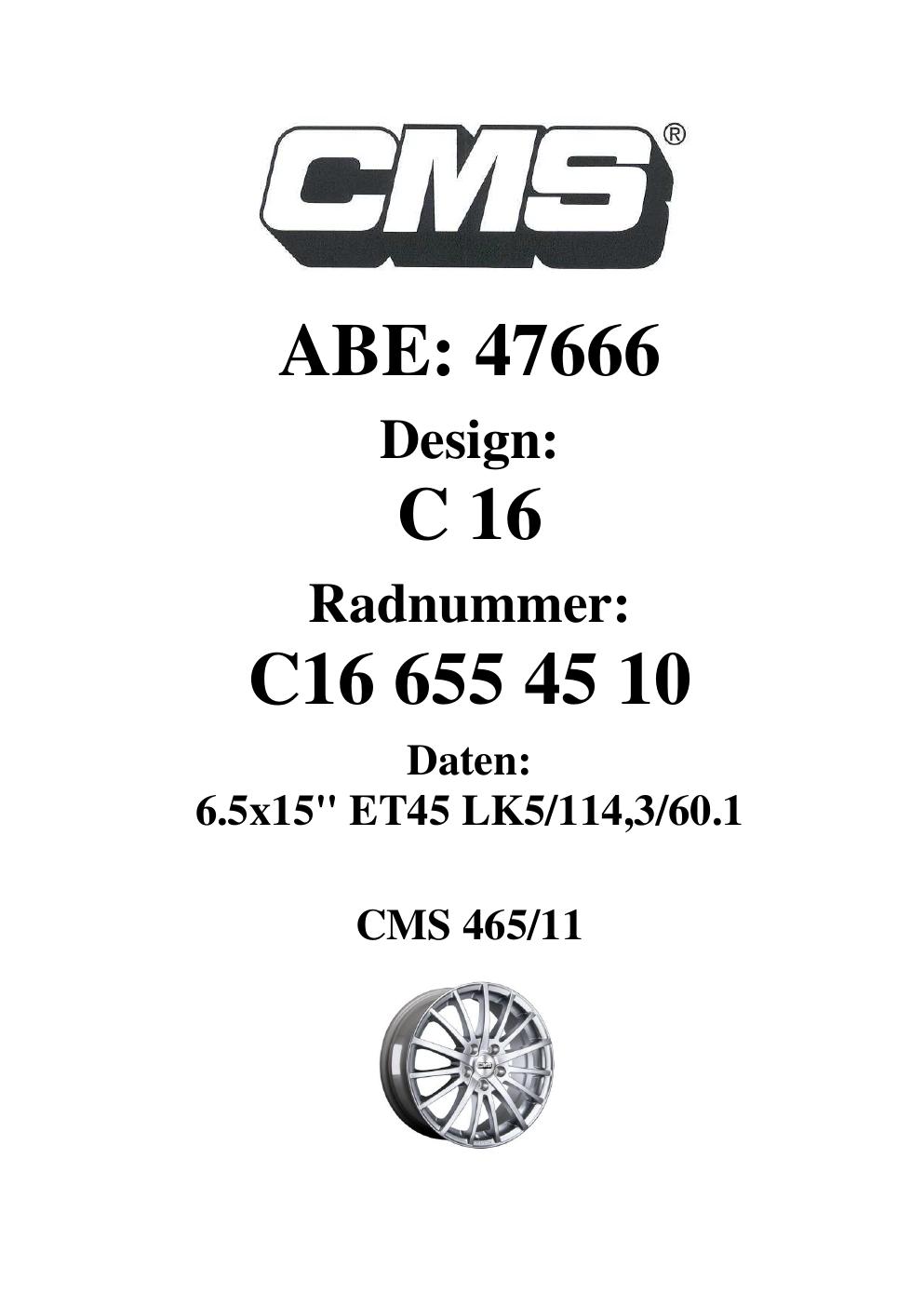 Dieses Gutachten (ABE) bezieht sich auf die Alufelge CMS C16 in der Ausführung 6.5Jx15 ET 0, Mittenloch 0 mm (KBA 47666). Im PDF findest du typischerweise zulässige Reifengrößen, Auflagen/Anbauhinweise und – je nach Dokument – Hinweise zur Eintragung.