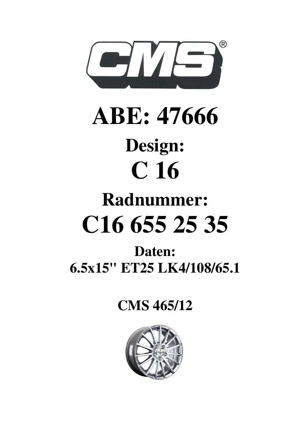 Dieses Gutachten (ABE) bezieht sich auf die Alufelge CMS C16 in der Ausführung 6.5Jx15 ET 0, Mittenloch 0 mm (KBA 47666). Im PDF findest du typischerweise zulässige Reifengrößen, Auflagen/Anbauhinweise und – je nach Dokument – Hinweise zur Eintragung.