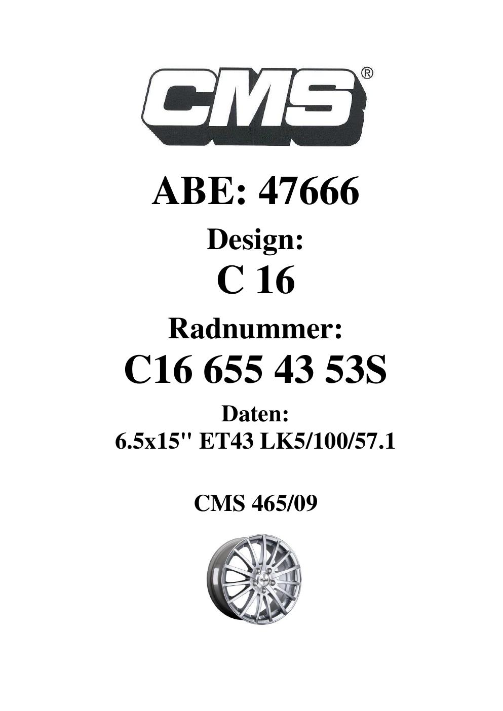 Dieses ABE gehört zur Felge CMS C16 in 6.5Jx15 ET0 mit KBA 47666. Die Seite ist dafür gedacht, dass du schnell prüfen kannst, ob KBA, Design und Größe zu deiner Felge passen und danach direkt das richtige PDF lädst.