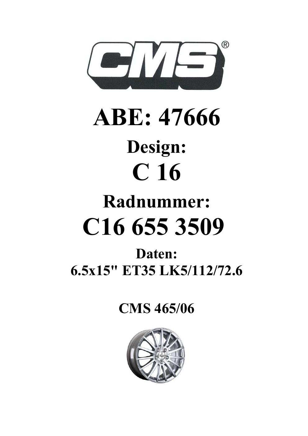 Dieses Gutachten (ABE) bezieht sich auf die Alufelge CMS C16 in der Ausführung 6.5Jx15 ET 0, Mittenloch 0 mm (KBA 47666). Im PDF findest du typischerweise zulässige Reifengrößen, Auflagen/Anbauhinweise und – je nach Dokument – Hinweise zur Eintragung.