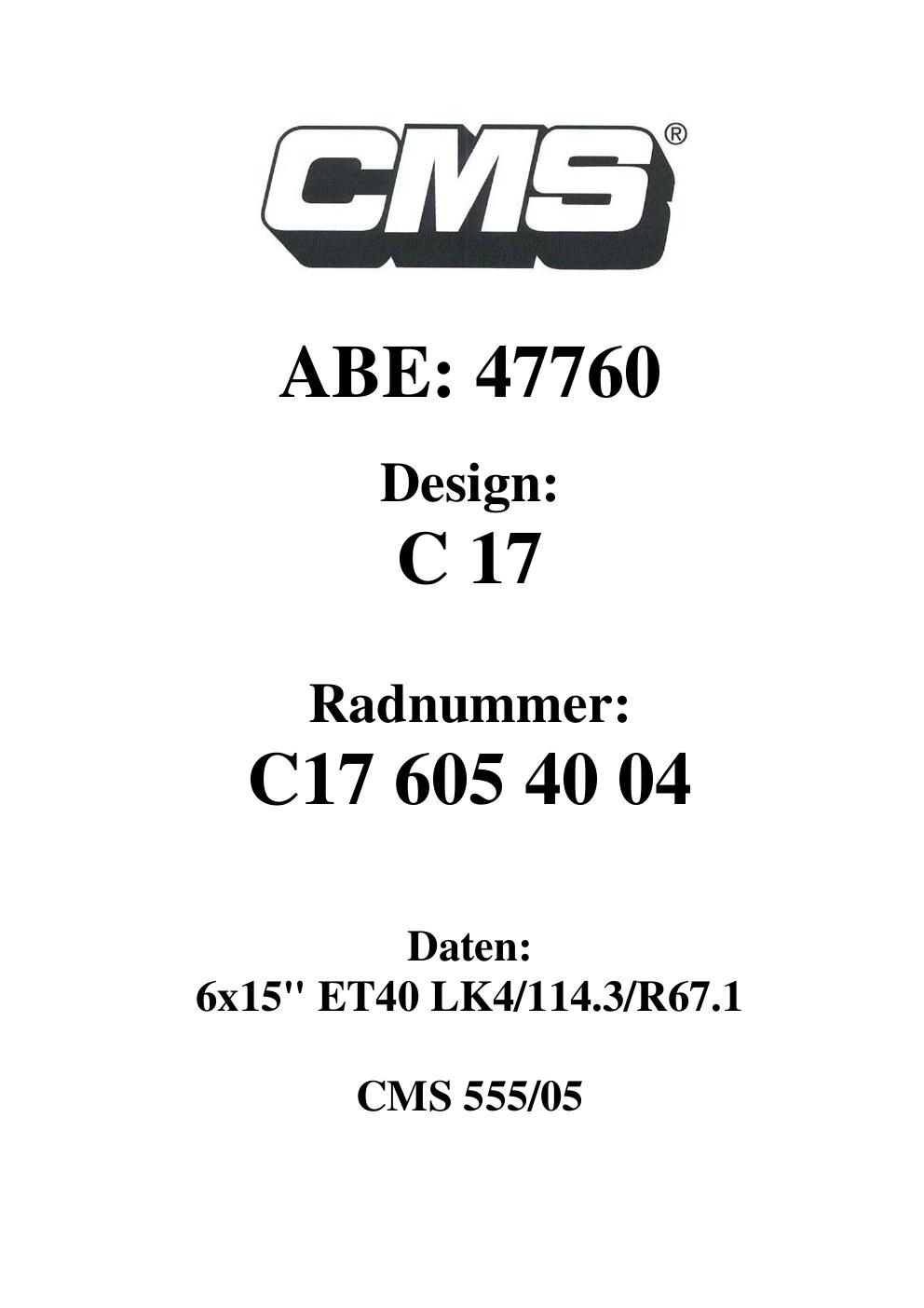 Dieses Gutachten (ABE) bezieht sich auf die Alufelge CMS C17 in der Ausführung 6Jx15 ET 0, Mittenloch 0 mm (KBA 47760). Im PDF findest du typischerweise zulässige Reifengrößen, Auflagen/Anbauhinweise und – je nach Dokument – Hinweise zur Eintragung.