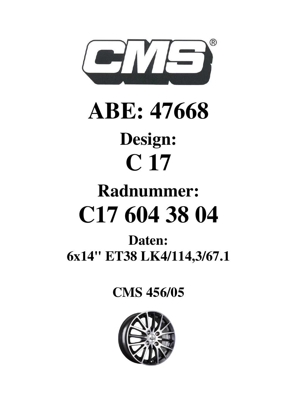 Dieses Gutachten (ABE) bezieht sich auf die Alufelge CMS C17 in der Ausführung 6Jx14 ET 0, Mittenloch 0 mm (KBA 47668). Im PDF findest du typischerweise zulässige Reifengrößen, Auflagen/Anbauhinweise und – je nach Dokument – Hinweise zur Eintragung.