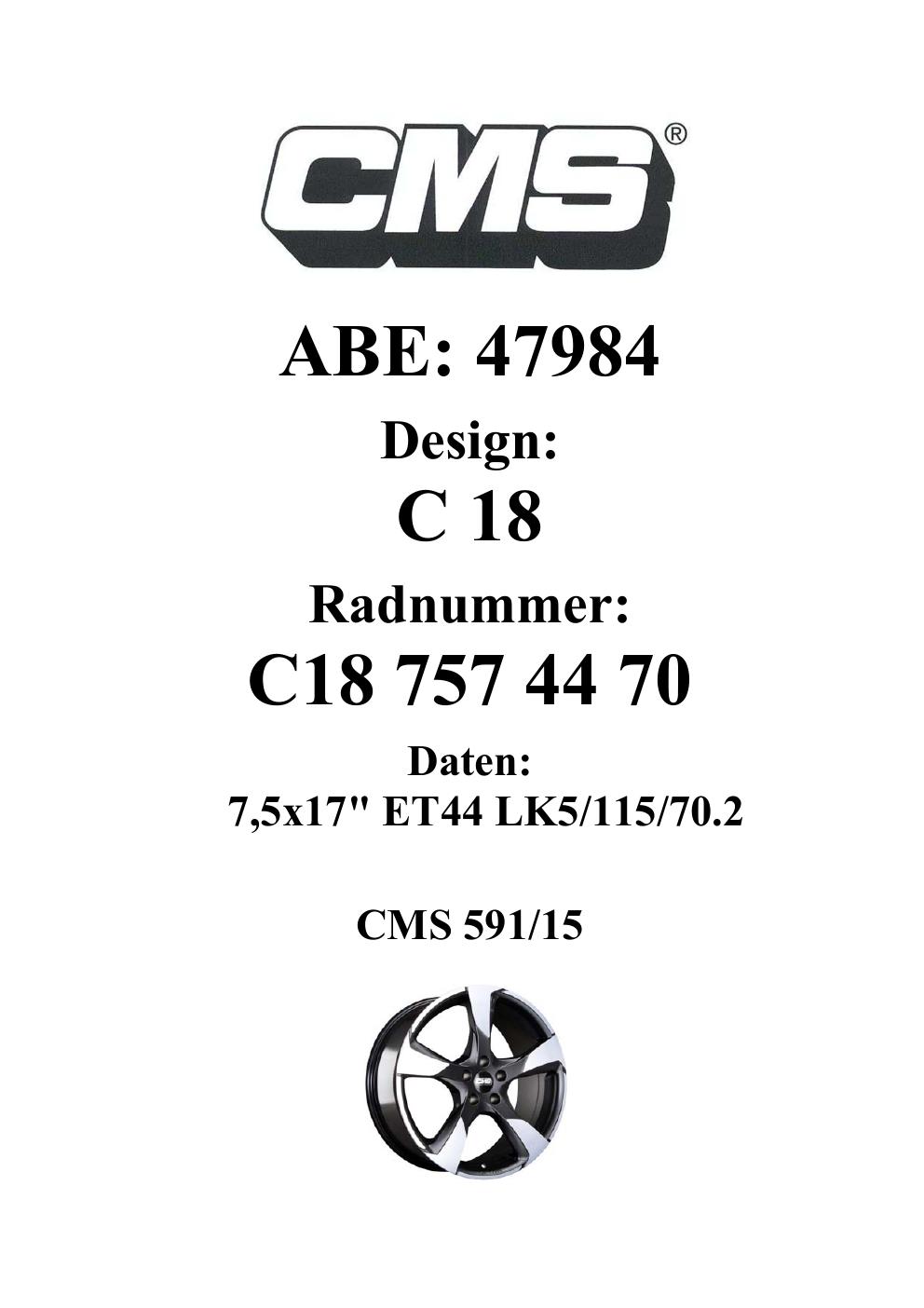Dieses Gutachten (ABE) bezieht sich auf die Alufelge CMS C18 in der Ausführung 7.5Jx17 ET 0, Mittenloch 0 mm (KBA 47984). Im PDF findest du typischerweise zulässige Reifengrößen, Auflagen/Anbauhinweise und – je nach Dokument – Hinweise zur Eintragung.