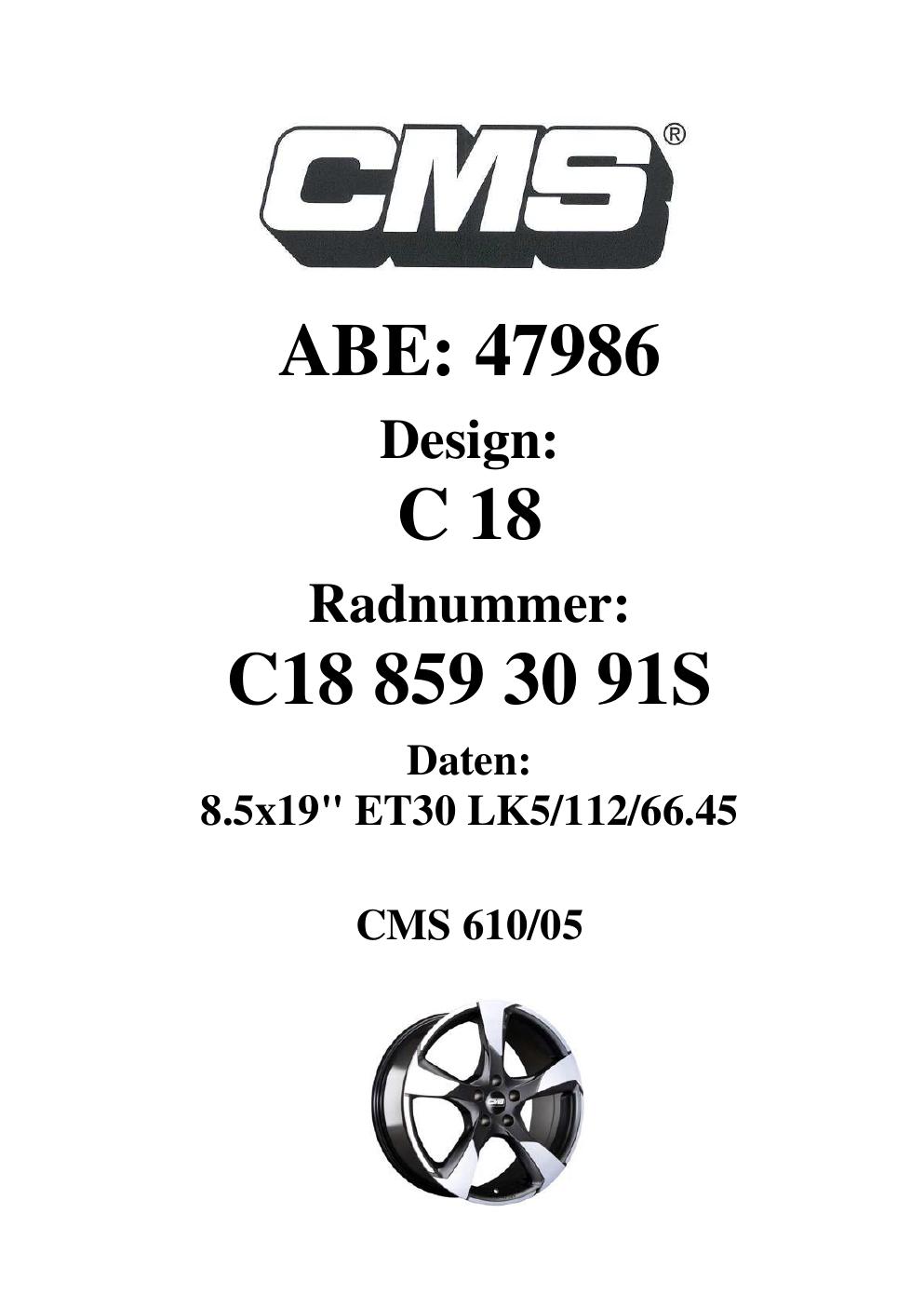 Dieses Gutachten (ABE) bezieht sich auf die Alufelge CMS C18 in der Ausführung 8.5Jx19 ET 0, Mittenloch 0 mm (KBA 47986). Im PDF findest du typischerweise zulässige Reifengrößen, Auflagen/Anbauhinweise und – je nach Dokument – Hinweise zur Eintragung.