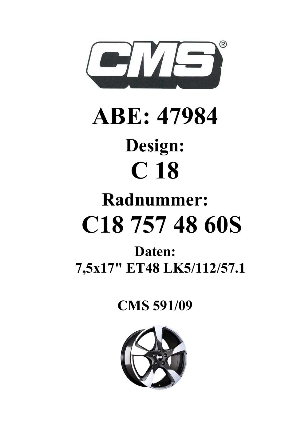 Dieses Gutachten (ABE) bezieht sich auf die Alufelge CMS C18 in der Ausführung 7.5Jx17 ET 0, Mittenloch 0 mm (KBA 47984). Im PDF findest du typischerweise zulässige Reifengrößen, Auflagen/Anbauhinweise und – je nach Dokument – Hinweise zur Eintragung.
