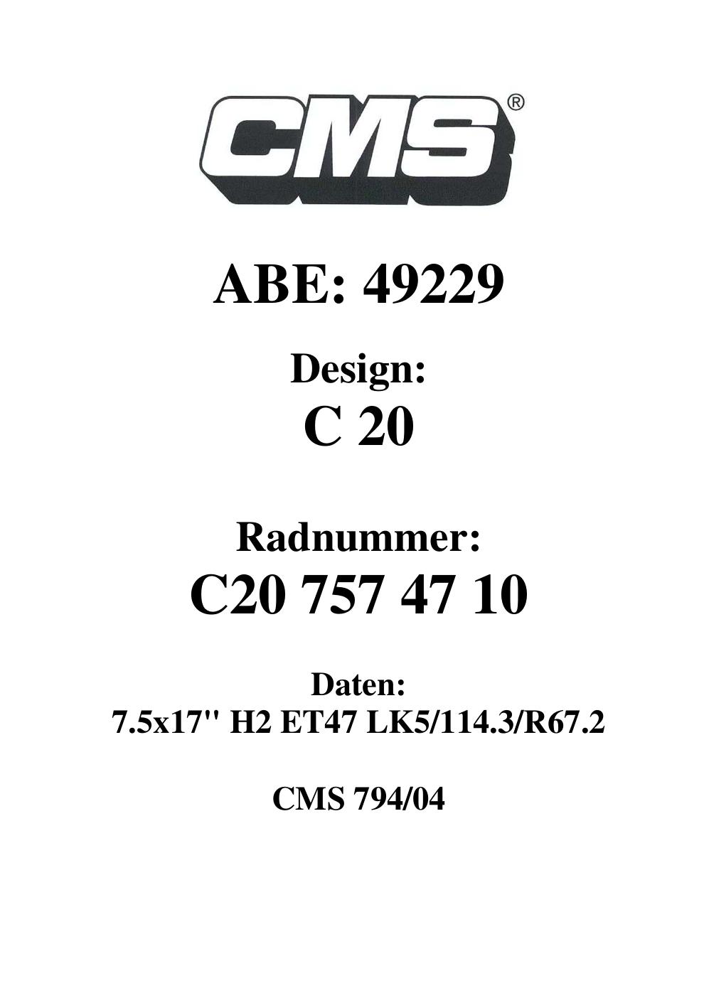 Dieses Gutachten (ABE) bezieht sich auf die Alufelge CMS C20 in der Ausführung 7.5Jx17 ET 0, Mittenloch 0 mm (KBA 49229). Im PDF findest du typischerweise zulässige Reifengrößen, Auflagen/Anbauhinweise und – je nach Dokument – Hinweise zur Eintragung.