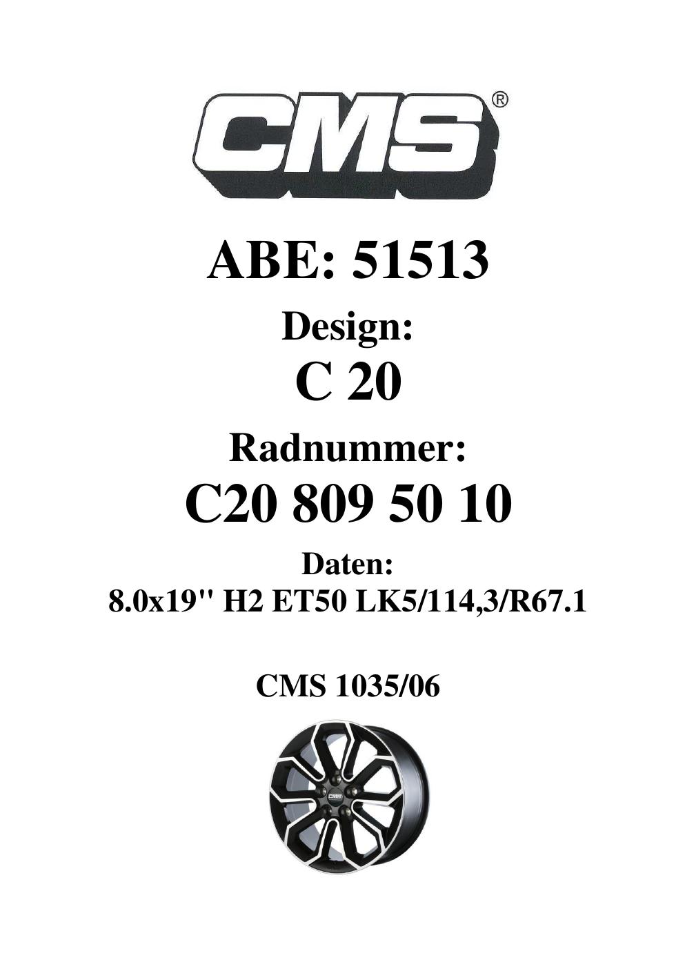 Dieses Gutachten (ABE) bezieht sich auf die Alufelge CMS C20 in der Ausführung 8Jx19 ET 0, Mittenloch 0 mm (KBA 51513). Im PDF findest du typischerweise zulässige Reifengrößen, Auflagen/Anbauhinweise und – je nach Dokument – Hinweise zur Eintragung.