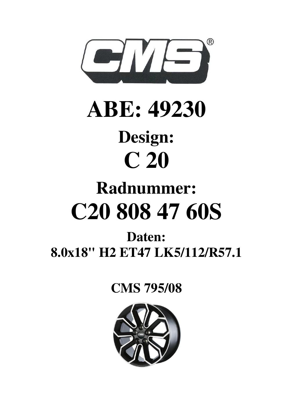 Dieses Gutachten (ABE) bezieht sich auf die Alufelge CMS C20 in der Ausführung 8Jx18 ET 0, Mittenloch 0 mm (KBA 49230). Im PDF findest du typischerweise zulässige Reifengrößen, Auflagen/Anbauhinweise und – je nach Dokument – Hinweise zur Eintragung.