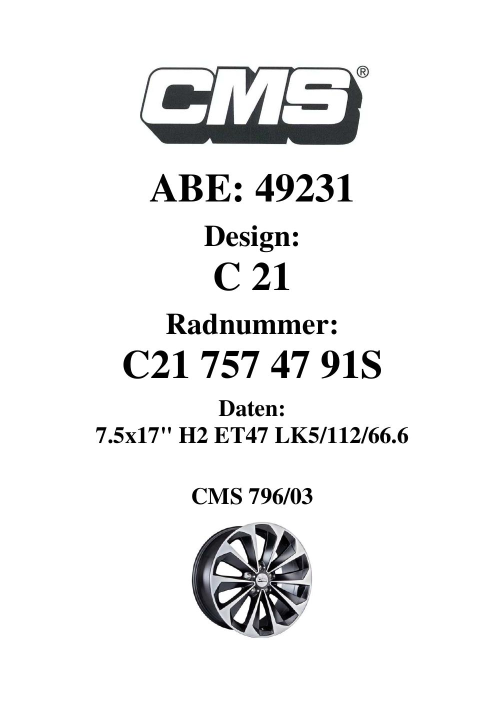 Dieses Gutachten (ABE) bezieht sich auf die Alufelge CMS C21 in der Ausführung 7.5Jx17 ET 0, Mittenloch 0 mm (KBA 49231). Im PDF findest du typischerweise zulässige Reifengrößen, Auflagen/Anbauhinweise und – je nach Dokument – Hinweise zur Eintragung.