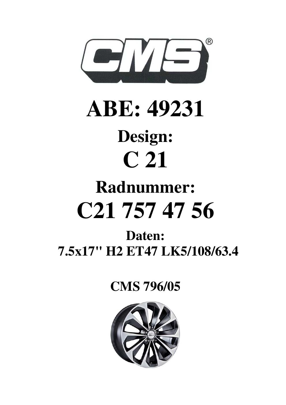 Dieses Gutachten (ABE) bezieht sich auf die Alufelge CMS C21 in der Ausführung 7.5Jx17 ET 0, Mittenloch 0 mm (KBA 49231). Im PDF findest du typischerweise zulässige Reifengrößen, Auflagen/Anbauhinweise und – je nach Dokument – Hinweise zur Eintragung.
