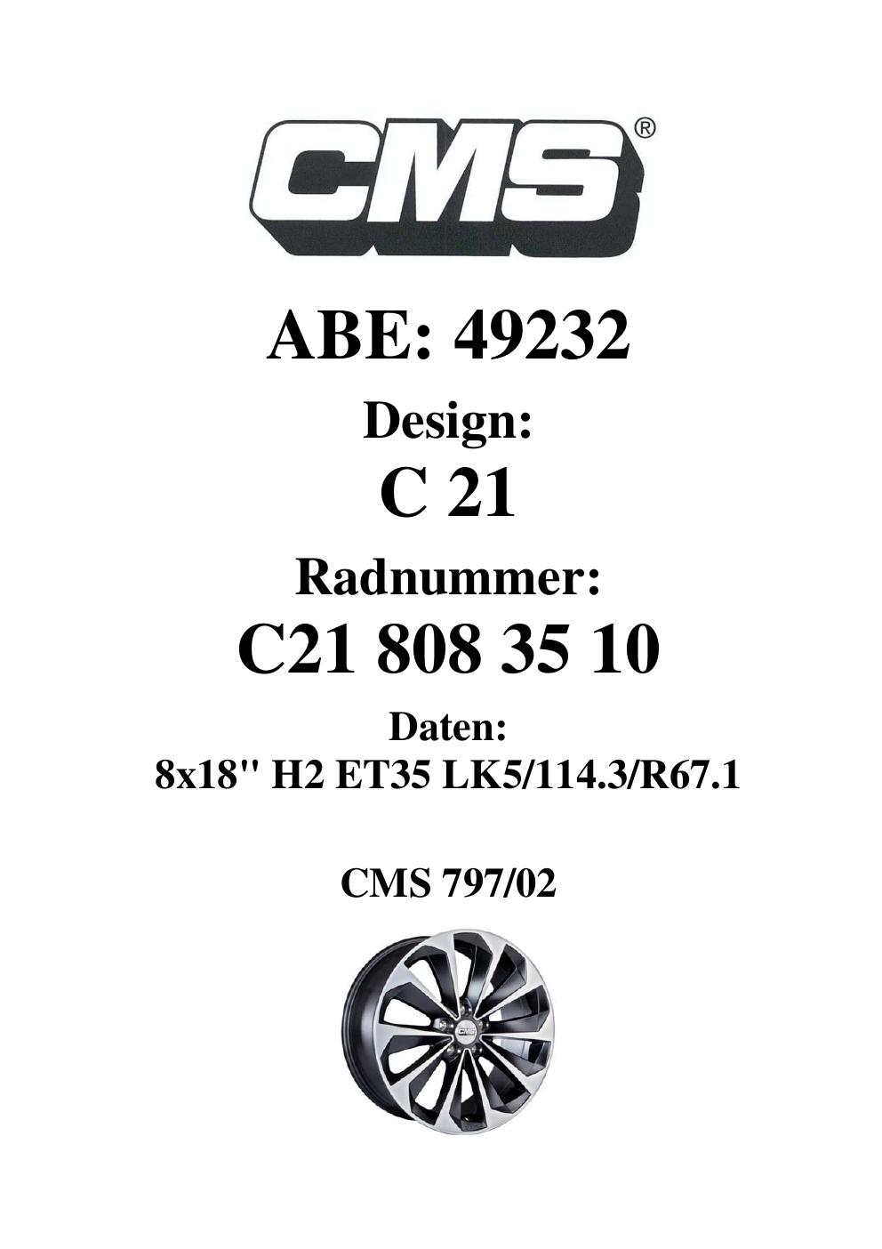 Felgengutachten / ABE für Alufelgen CMS C21 (8Jx18 ET 0, Mittenloch 0 mm) mit KBA 49232 (Zertifikatsnummer 49232). Hier kostenlos als PDF herunterladen. Der Download-Link ist 24 Stunden gültig und kann bis zu zwei Mal verwendet werden.