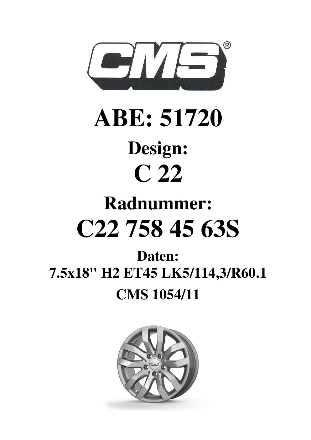 Dieses Gutachten (ABE) bezieht sich auf die Alufelge CMS C22 in der Ausführung 7.5Jx18 ET 0, Mittenloch 0 mm (KBA 51720). Im PDF findest du typischerweise zulässige Reifengrößen, Auflagen/Anbauhinweise und – je nach Dokument – Hinweise zur Eintragung.