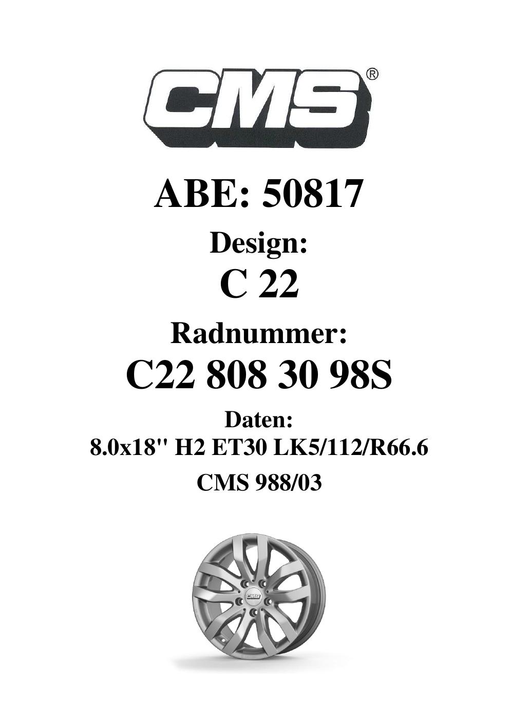 Dieses Gutachten (ABE) bezieht sich auf die Alufelge CMS C22 in der Ausführung 8Jx18 ET 0, Mittenloch 0 mm (KBA 50817). Im PDF findest du typischerweise zulässige Reifengrößen, Auflagen/Anbauhinweise und – je nach Dokument – Hinweise zur Eintragung.