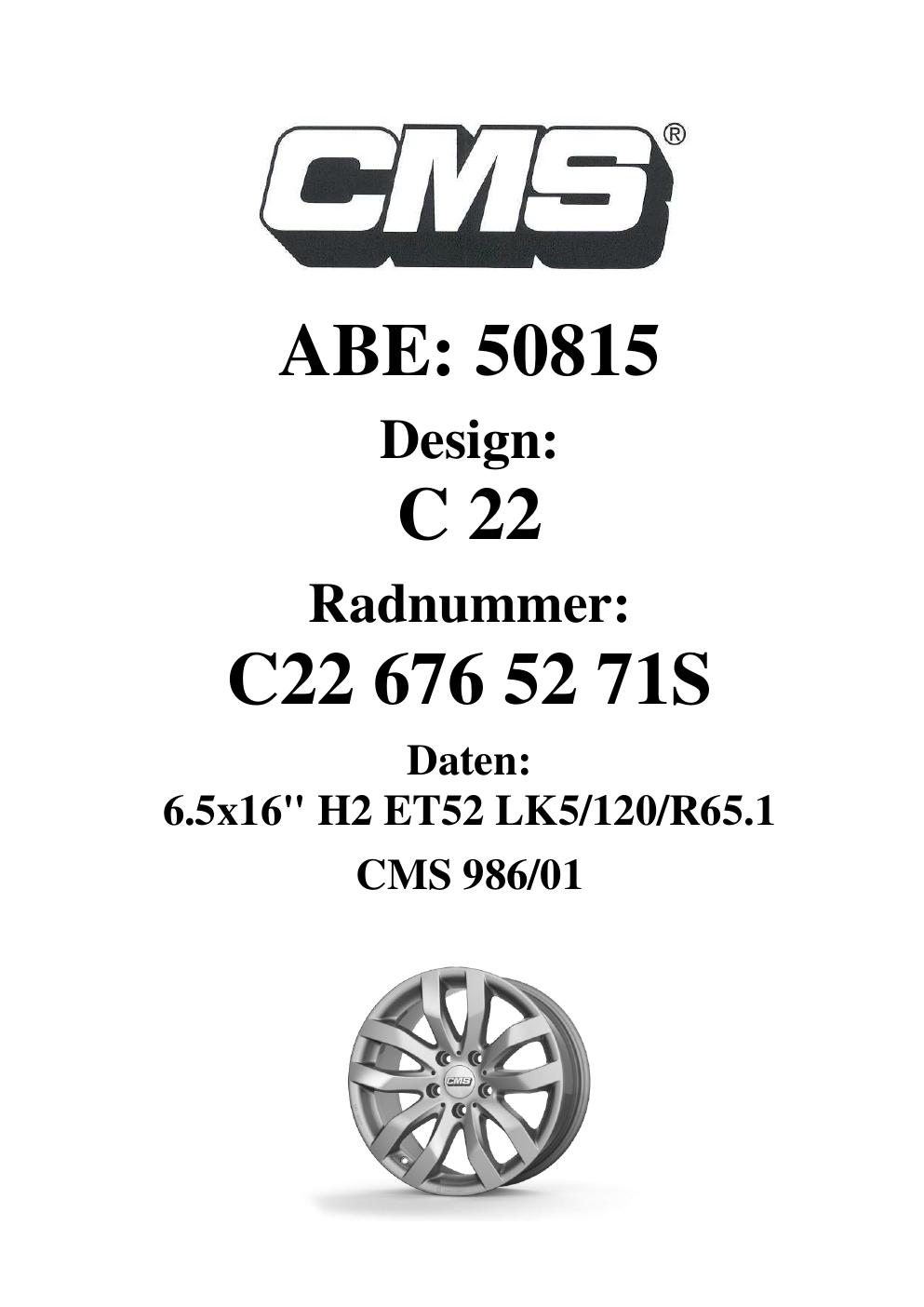 Dieses Gutachten (ABE) bezieht sich auf die Alufelge CMS C22 in der Ausführung 6.5Jx16 ET 0, Mittenloch 0 mm (KBA 50815). Im PDF findest du typischerweise zulässige Reifengrößen, Auflagen/Anbauhinweise und – je nach Dokument – Hinweise zur Eintragung.