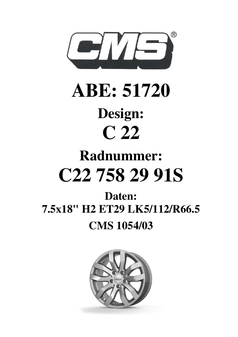 Dieses Gutachten (ABE) bezieht sich auf die Alufelge CMS C22 in der Ausführung 7.5Jx18 ET 0, Mittenloch 0 mm (KBA 51720). Im PDF findest du typischerweise zulässige Reifengrößen, Auflagen/Anbauhinweise und – je nach Dokument – Hinweise zur Eintragung.