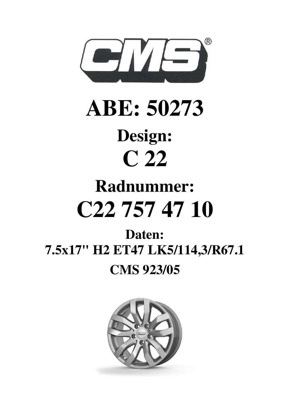 Dieses Gutachten (ABE) bezieht sich auf die Alufelge CMS C22 in der Ausführung 7.5Jx17 ET 0, Mittenloch 0 mm (KBA 50273). Im PDF findest du typischerweise zulässige Reifengrößen, Auflagen/Anbauhinweise und – je nach Dokument – Hinweise zur Eintragung.