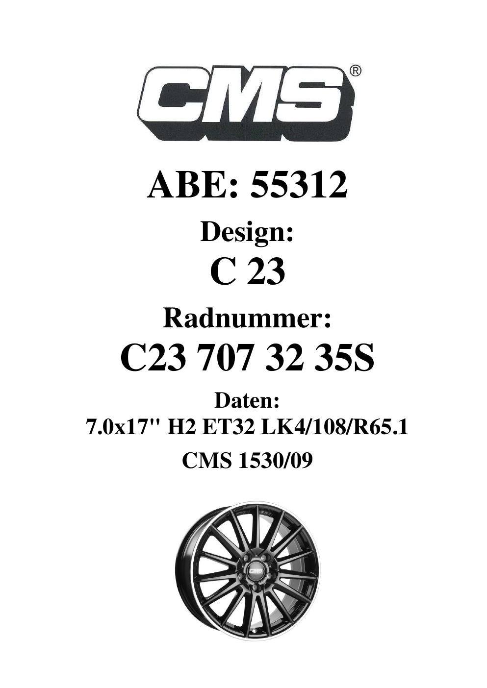 Dieses Gutachten (ABE) bezieht sich auf die Alufelge CMS C23 in der Ausführung 7Jx17 ET 0, Mittenloch 0 mm (KBA 55312). Im PDF findest du typischerweise zulässige Reifengrößen, Auflagen/Anbauhinweise und – je nach Dokument – Hinweise zur Eintragung.