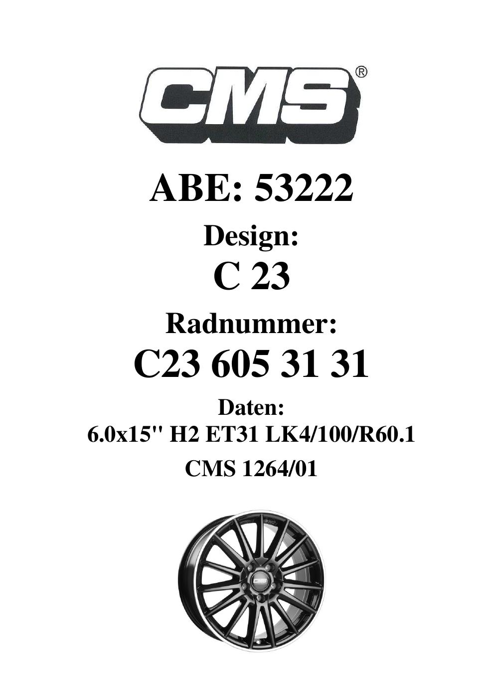 Dieses Gutachten (ABE) bezieht sich auf die Alufelge CMS C23 in der Ausführung 6Jx15 ET 0, Mittenloch 0 mm (KBA 53222). Im PDF findest du typischerweise zulässige Reifengrößen, Auflagen/Anbauhinweise und – je nach Dokument – Hinweise zur Eintragung.