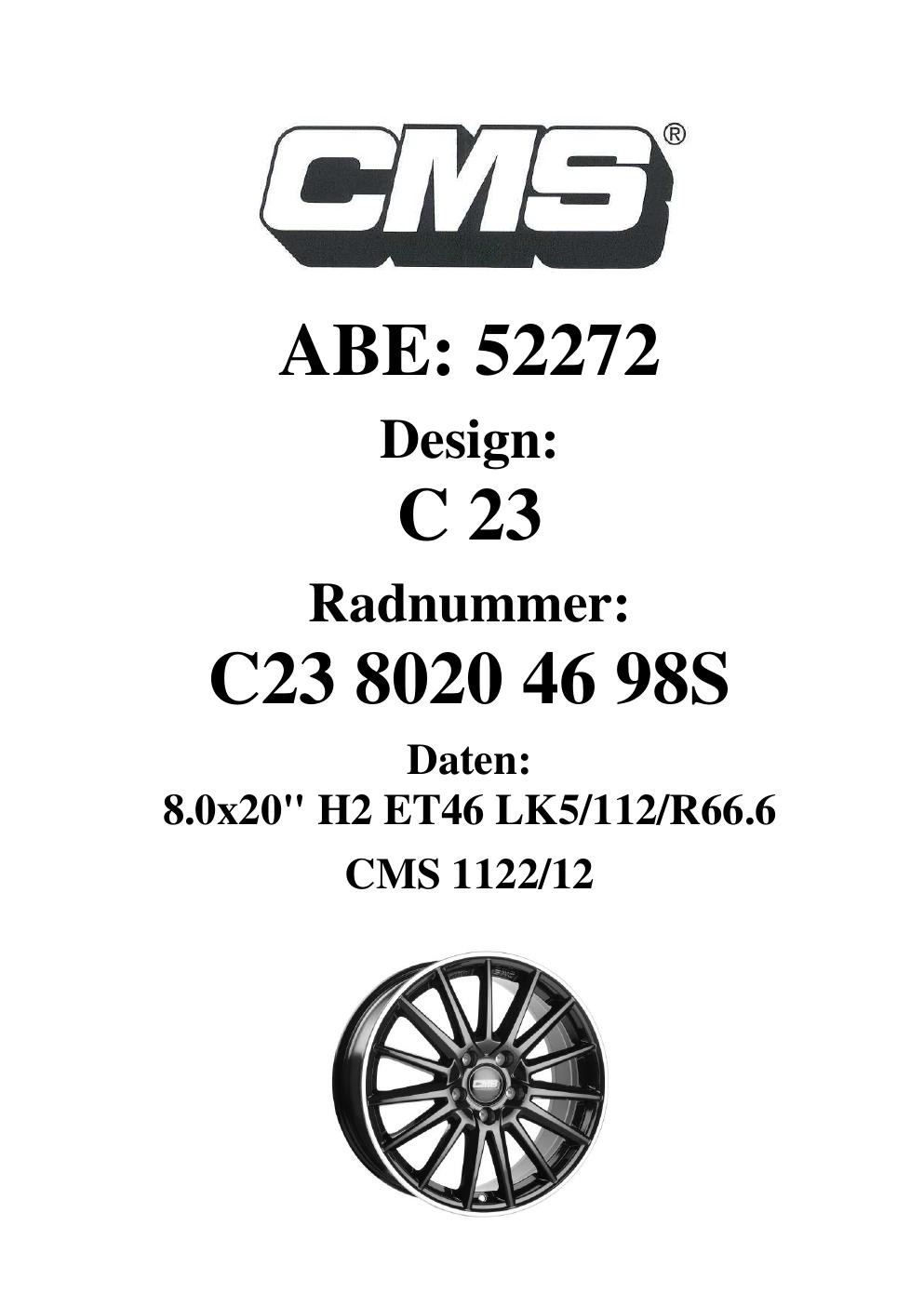 Dieses ABE gehört zur Felge CMS C23 in 8Jx2 ET0 mit KBA 52272. Die Seite ist dafür gedacht, dass du schnell prüfen kannst, ob KBA, Design und Größe zu deiner Felge passen und danach direkt das richtige PDF lädst.