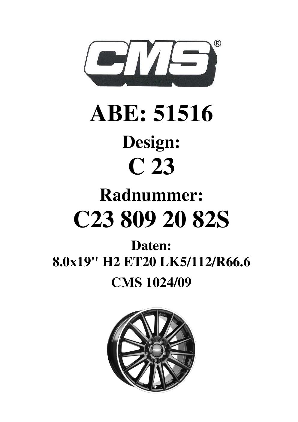 Dieses Gutachten (ABE) bezieht sich auf die Alufelge CMS C23 in der Ausführung 8Jx19 ET 0, Mittenloch 0 mm (KBA 51516). Im PDF findest du typischerweise zulässige Reifengrößen, Auflagen/Anbauhinweise und – je nach Dokument – Hinweise zur Eintragung.