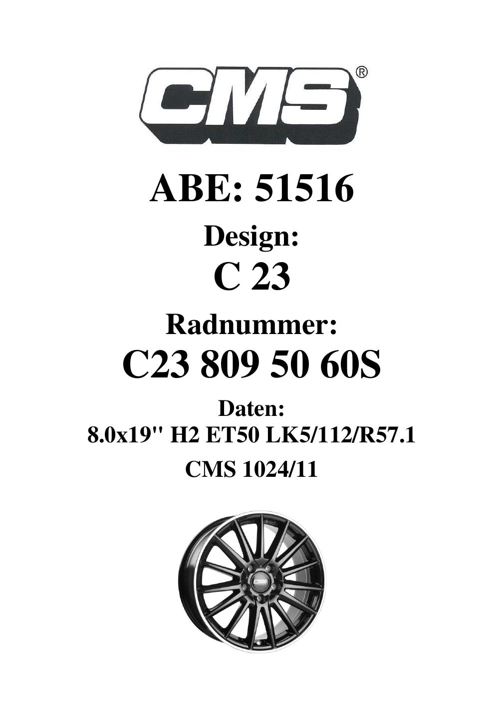Dieses Gutachten (ABE) bezieht sich auf die Alufelge CMS C23 in der Ausführung 8Jx19 ET 0, Mittenloch 0 mm (KBA 51516). Im PDF findest du typischerweise zulässige Reifengrößen, Auflagen/Anbauhinweise und – je nach Dokument – Hinweise zur Eintragung.