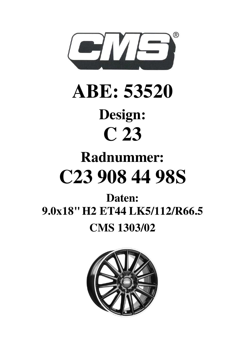Dieses Gutachten (ABE) bezieht sich auf die Alufelge CMS C23 in der Ausführung 9Jx18 ET 0, Mittenloch 0 mm (KBA 53520). Im PDF findest du typischerweise zulässige Reifengrößen, Auflagen/Anbauhinweise und – je nach Dokument – Hinweise zur Eintragung.