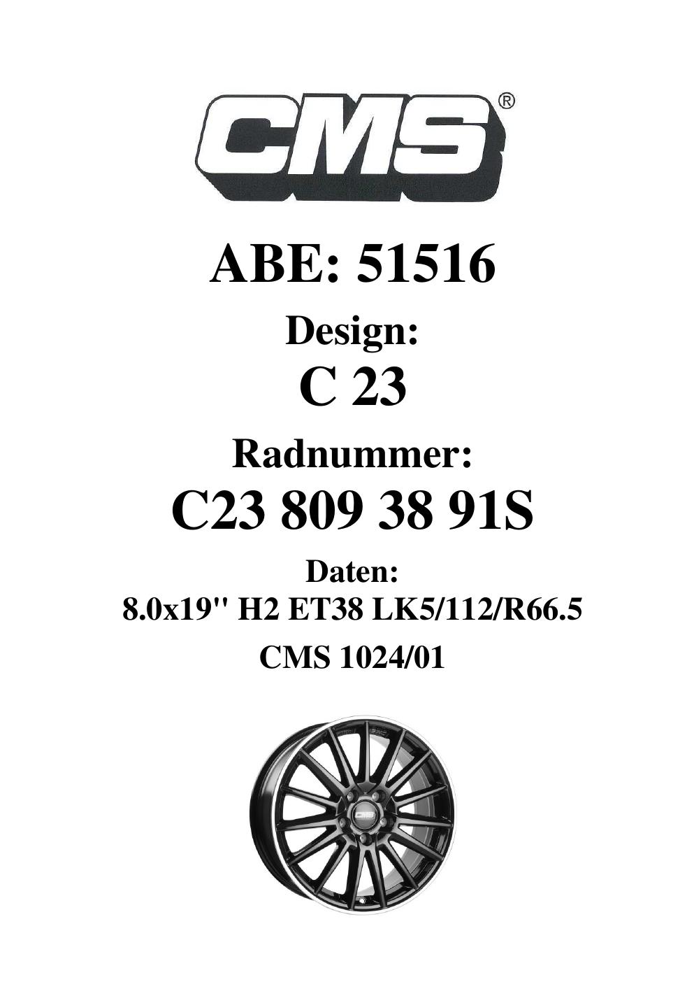 Felgengutachten / ABE für Alufelgen CMS C23 (8Jx19 ET 0, Mittenloch 0 mm) mit KBA 51516 (Zertifikatsnummer 51516). Hier kostenlos als PDF herunterladen. Der Download-Link ist 24 Stunden gültig und kann bis zu zwei Mal verwendet werden.