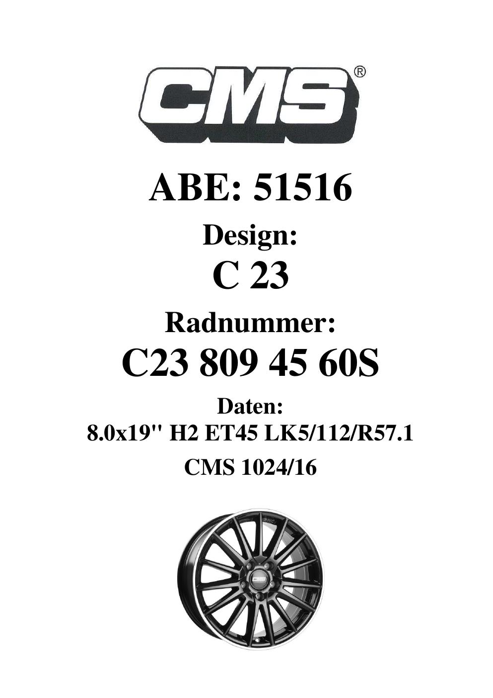Felgengutachten / ABE für Alufelgen CMS C23 (8Jx19 ET 0, Mittenloch 0 mm) mit KBA 51516 (Zertifikatsnummer 51516). Hier kostenlos als PDF herunterladen. Der Download-Link ist 24 Stunden gültig und kann bis zu zwei Mal verwendet werden.