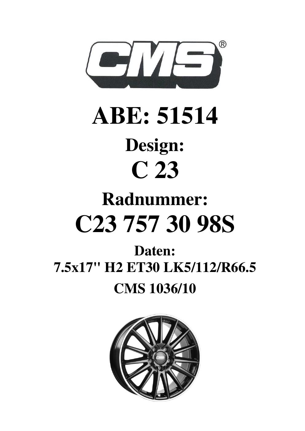 Dieses Gutachten (ABE) bezieht sich auf die Alufelge CMS C23 in der Ausführung 7.5Jx17 ET 0, Mittenloch 0 mm (KBA 51514). Im PDF findest du typischerweise zulässige Reifengrößen, Auflagen/Anbauhinweise und – je nach Dokument – Hinweise zur Eintragung.
