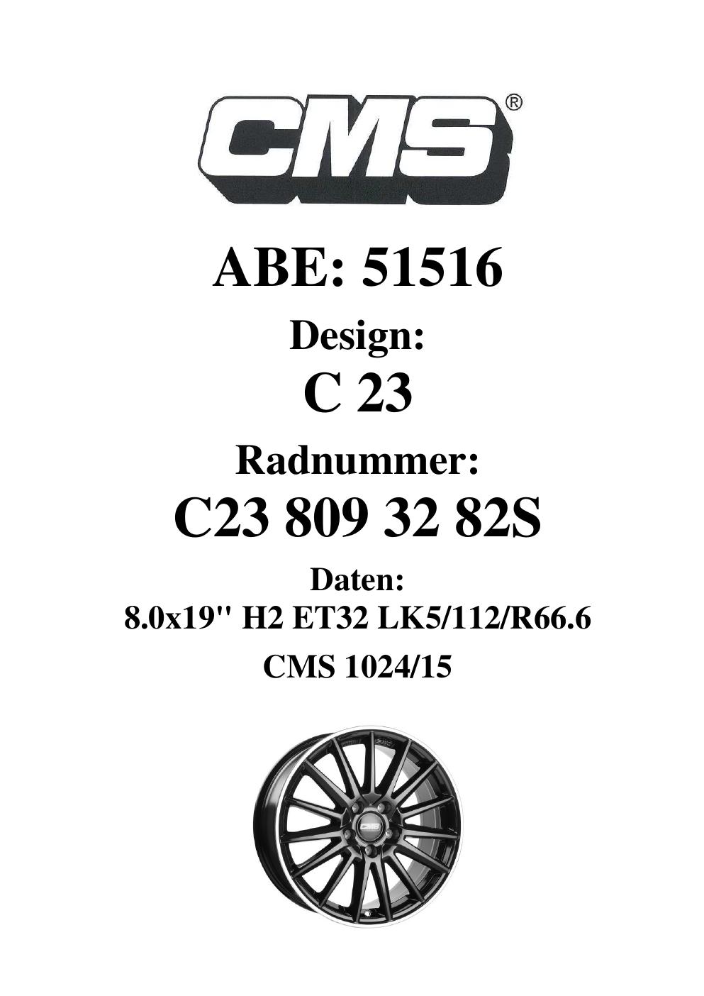 Felgengutachten / ABE für Alufelgen CMS C23 (8Jx19 ET 0, Mittenloch 0 mm) mit KBA 51516 (Zertifikatsnummer 51516). Hier kostenlos als PDF herunterladen. Der Download-Link ist 24 Stunden gültig und kann bis zu zwei Mal verwendet werden.