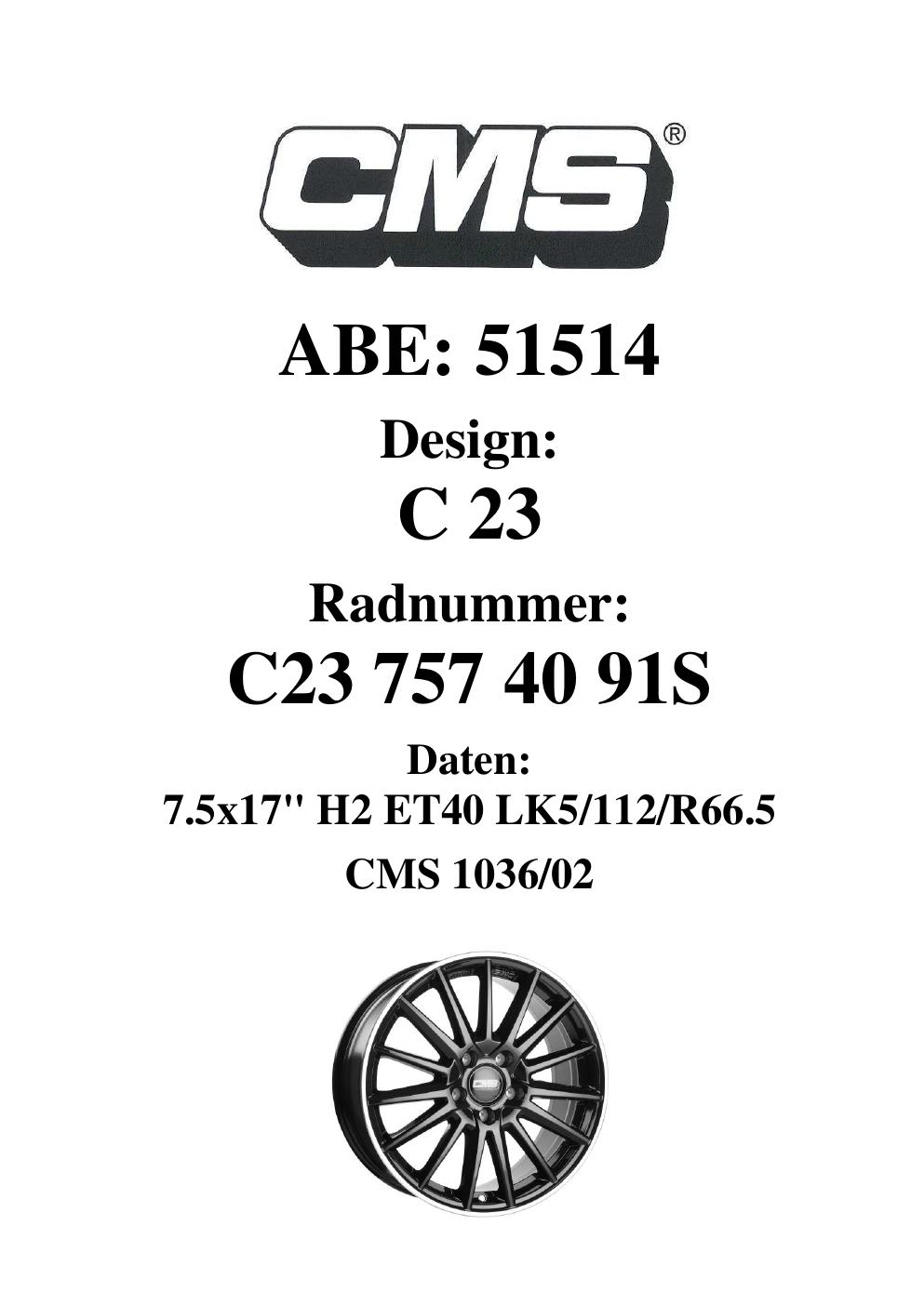 Dieses Gutachten (ABE) bezieht sich auf die Alufelge CMS C23 in der Ausführung 7.5Jx17 ET 0, Mittenloch 0 mm (KBA 51514). Im PDF findest du typischerweise zulässige Reifengrößen, Auflagen/Anbauhinweise und – je nach Dokument – Hinweise zur Eintragung.
