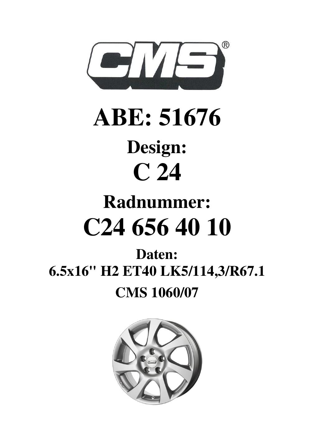 Dieses Gutachten (ABE) bezieht sich auf die Alufelge CMS C24 in der Ausführung 6.5Jx16 ET 0, Mittenloch 0 mm (KBA 51676). Im PDF findest du typischerweise zulässige Reifengrößen, Auflagen/Anbauhinweise und – je nach Dokument – Hinweise zur Eintragung.