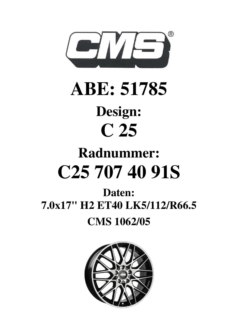 Dieses Gutachten (ABE) bezieht sich auf die Alufelge CMS C25 in der Ausführung 7Jx17 ET 0, Mittenloch 0 mm (KBA 51785). Im PDF findest du typischerweise zulässige Reifengrößen, Auflagen/Anbauhinweise und – je nach Dokument – Hinweise zur Eintragung.