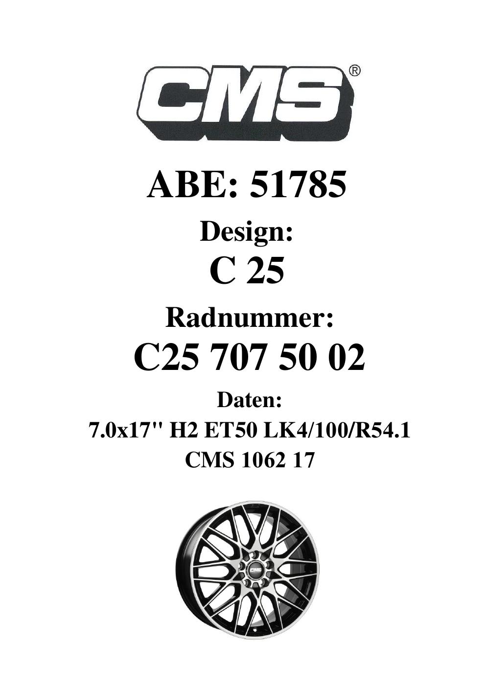 Dieses ABE gehört zur Felge CMS C25 in 7Jx17 ET0 mit KBA 51785. Die Seite ist dafür gedacht, dass du schnell prüfen kannst, ob KBA, Design und Größe zu deiner Felge passen und danach direkt das richtige PDF lädst.