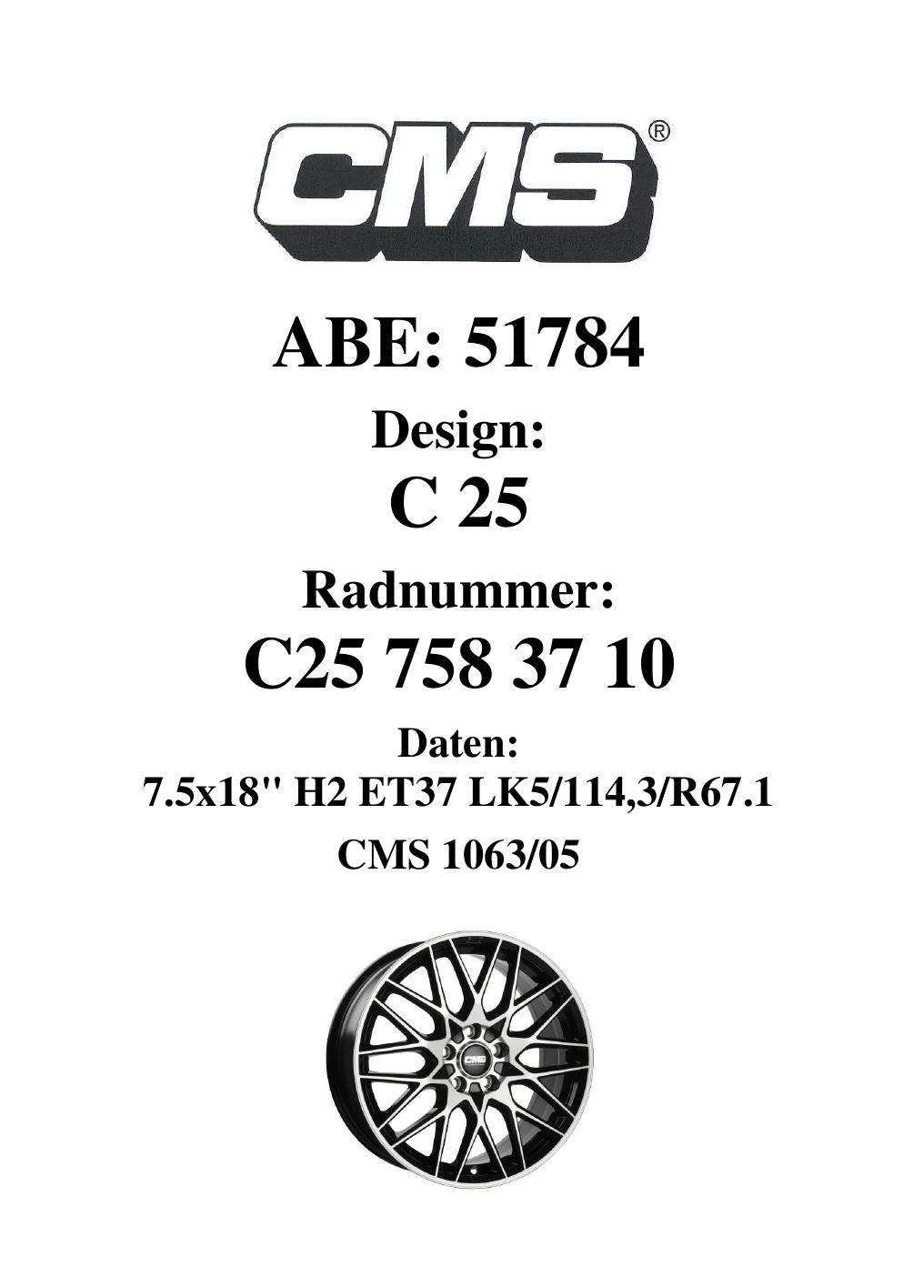 Dieses Gutachten (ABE) bezieht sich auf die Alufelge CMS C25 in der Ausführung 7.5Jx18 ET 0, Mittenloch 0 mm (KBA 51784). Im PDF findest du typischerweise zulässige Reifengrößen, Auflagen/Anbauhinweise und – je nach Dokument – Hinweise zur Eintragung.