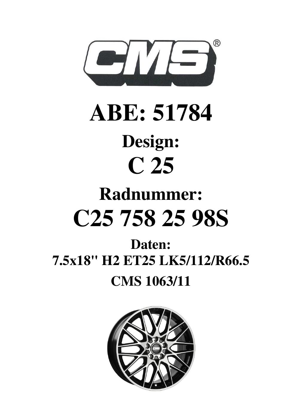 Dieses Gutachten (ABE) bezieht sich auf die Alufelge CMS C25 in der Ausführung 7.5Jx18 ET 0, Mittenloch 0 mm (KBA 51784). Im PDF findest du typischerweise zulässige Reifengrößen, Auflagen/Anbauhinweise und – je nach Dokument – Hinweise zur Eintragung.