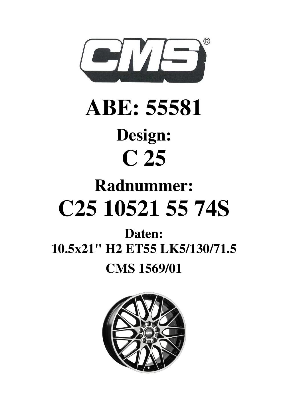 Dieses Gutachten (ABE) bezieht sich auf die Alufelge CMS C25 in der Ausführung 10.5Jx21 ET 0, Mittenloch 0 mm (KBA 55581). Im PDF findest du typischerweise zulässige Reifengrößen, Auflagen/Anbauhinweise und – je nach Dokument – Hinweise zur Eintragung.