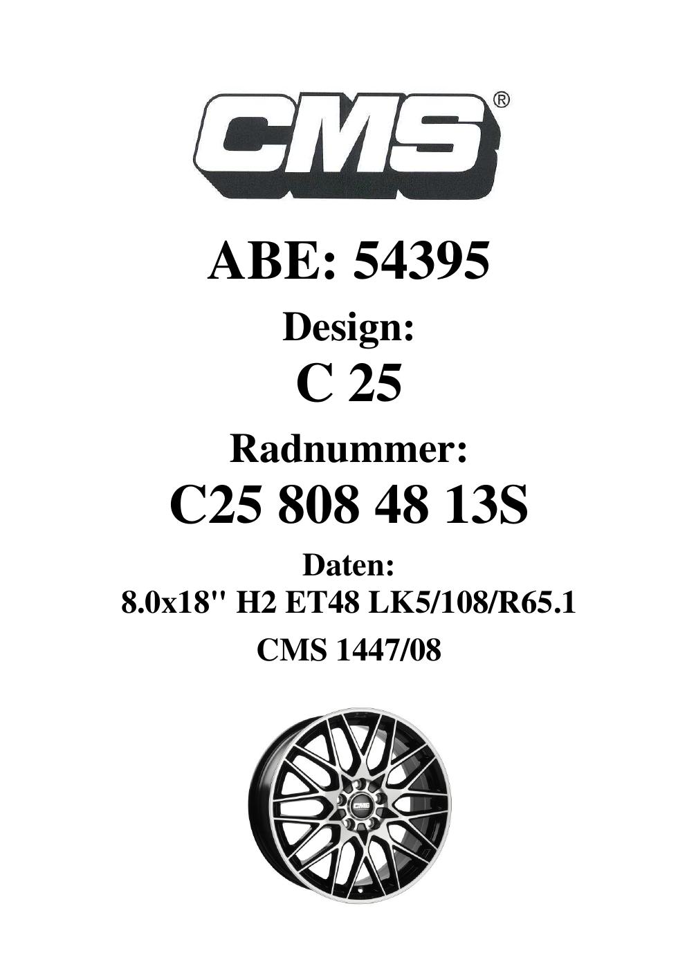 Dieses Gutachten (ABE) bezieht sich auf die Alufelge CMS C25 in der Ausführung 8Jx18 ET 0, Mittenloch 0 mm (KBA 54395). Im PDF findest du typischerweise zulässige Reifengrößen, Auflagen/Anbauhinweise und – je nach Dokument – Hinweise zur Eintragung.