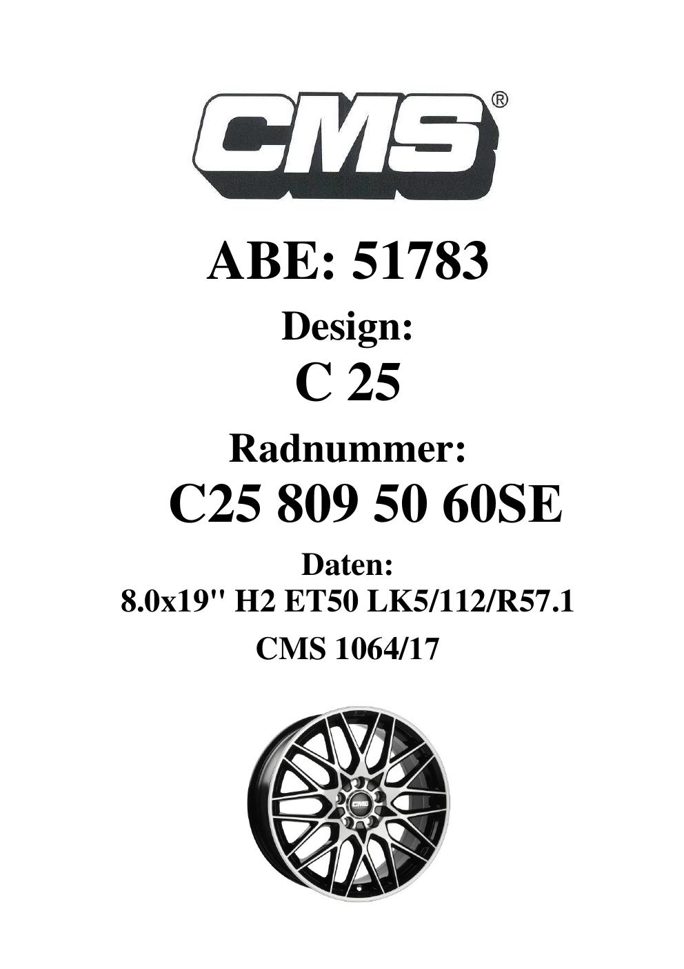 Dieses Gutachten (ABE) bezieht sich auf die Alufelge CMS C25 in der Ausführung 8Jx19 ET 0, Mittenloch 0 mm (KBA 51783). Im PDF findest du typischerweise zulässige Reifengrößen, Auflagen/Anbauhinweise und – je nach Dokument – Hinweise zur Eintragung.