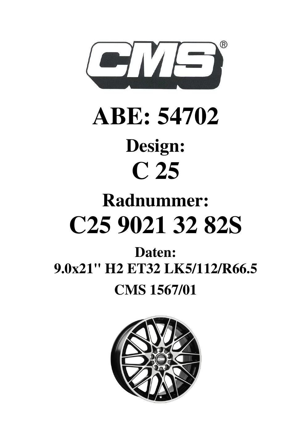 Dieses Gutachten (ABE) bezieht sich auf die Alufelge CMS C25 in der Ausführung 9Jx21 ET 0, Mittenloch 0 mm (KBA 54702). Im PDF findest du typischerweise zulässige Reifengrößen, Auflagen/Anbauhinweise und – je nach Dokument – Hinweise zur Eintragung.