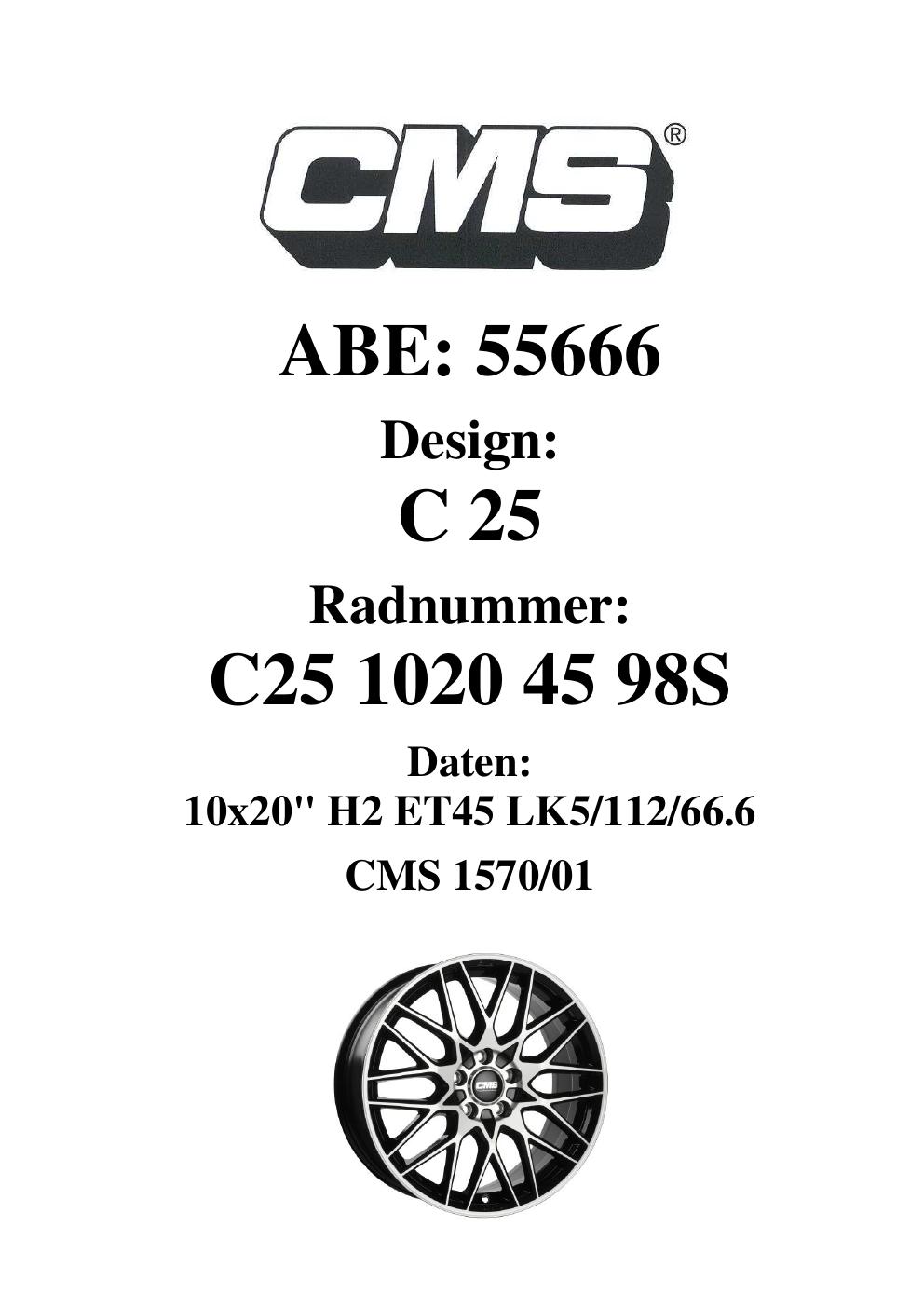 Dieses Gutachten (ABE) bezieht sich auf die Alufelge CMS C25 in der Ausführung 10Jx2 ET 0, Mittenloch 0 mm (KBA 55666). Im PDF findest du typischerweise zulässige Reifengrößen, Auflagen/Anbauhinweise und – je nach Dokument – Hinweise zur Eintragung.